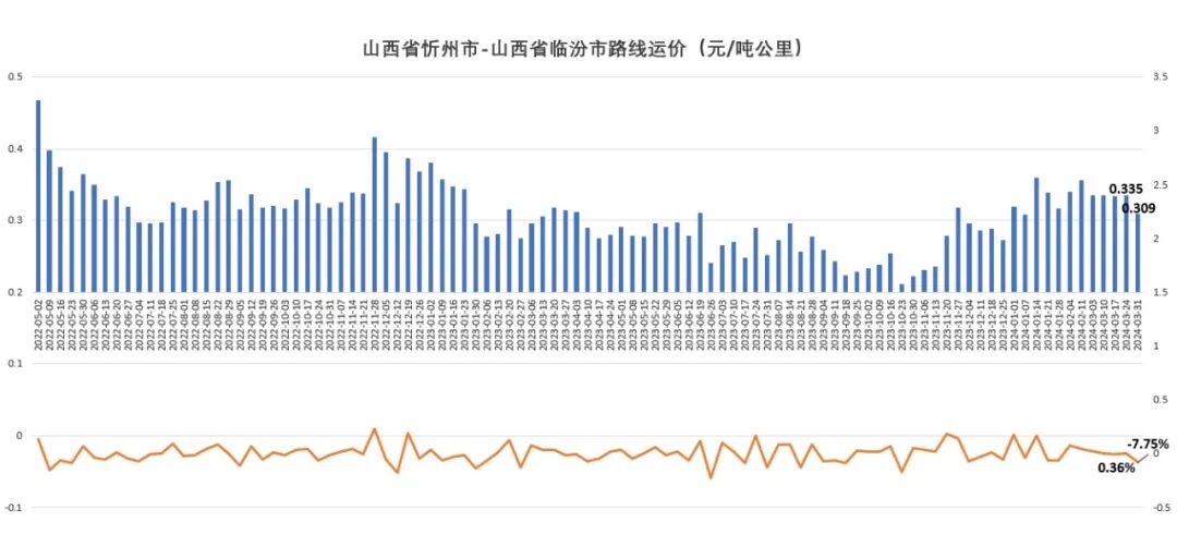 本周忻州至临汾干线周平均价为120.32元/吨,按公里数折算为0.309元/吨公里,下跌7.75%。