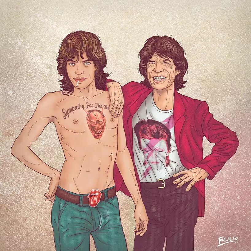 后来的米克·贾格尔还保持着鲜肉时期的发型,拗着相似的造型,T恤上印着英伦摇滚变色龙大卫·鲍威(David Bowie)。