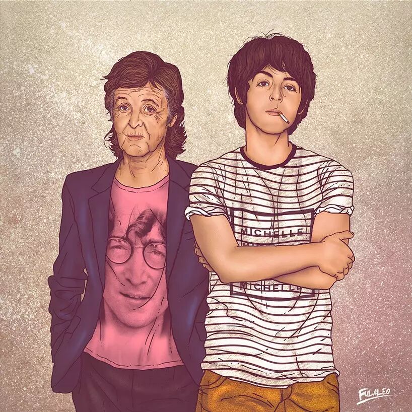 作为前披头士成员,老了的保罗·麦卡特尼穿了一件印着约翰·列侬的T恤。