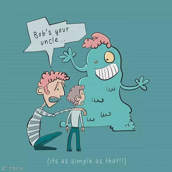 ▲Bob's your uncle “看到那怪物了吗?那是你叔叔!” 其实一开始就是“我爸是李刚”,有后台好办事的意思。后来引申为做成这件事轻而易举,就像你叔叔是鲍勃一样!(还是感觉好绕)
