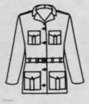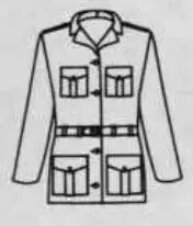 从前设计给非洲打猎用的服装。单排扣、长度及臀,胸口和髋部各有两个褶裥口袋(bellows pockets),有腰带(belt)。又叫bush jacket(丛林夹克)。