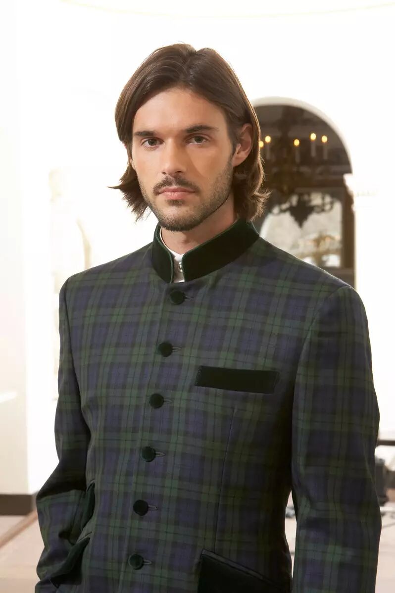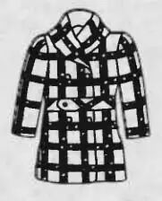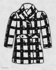 双排扣、青果领或高领、有腰带,材质为方格厚呢(blanket-like wool fabric with a striped or plaid design)。