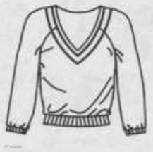 套穿(pull-on),长袖毛衣,V领(V-neck),或带针织花纹(cable-knit pattern),通常在领子和手腕处有细窄条状颜色(narrow bands of color)装饰。