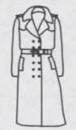 防水布料(water repellent fabric)制成,质地较硬,多为双排扣,高领(high stand collar),宽大翻领,带肩章(epaulets),带扣腰带(belt with buckle),切缝衣袋(slash pockets)。