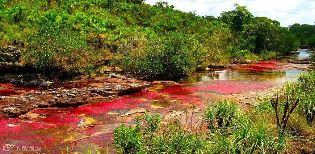 哥伦比亚卡诺克里斯塔尔彩虹河, 河底生有红色植物,配上黄色的石头、蓝色的水,宛若彩虹