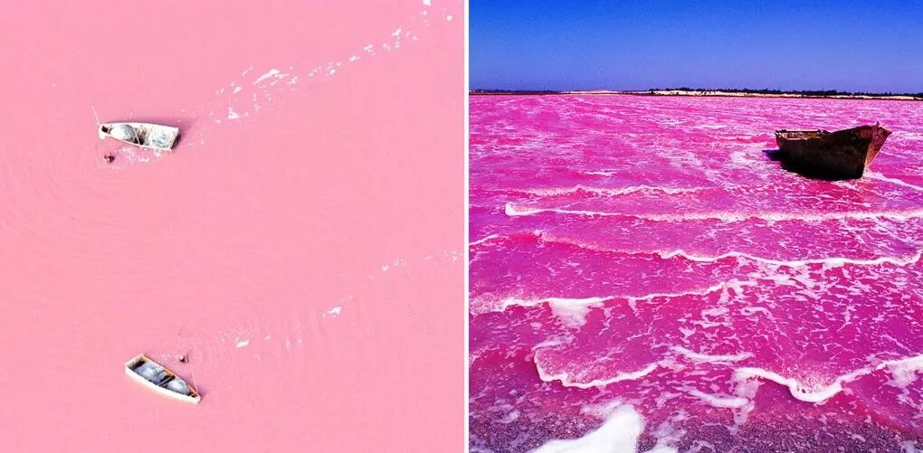 塞内加尔的玫瑰湖,因杜氏盐藻的存在使湖水呈现出类似草莓奶昔的粉色