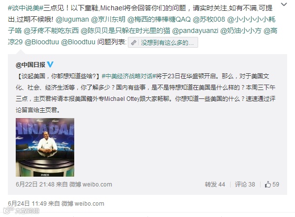 6月24日,中国日报官方微博面向900多万粉丝发起 “你心中的美国问题,开始一起#谈中说美#”的主题互动活动,围绕主题征集网友的提问,并邀请了本报美国籍外专 Michael Ottey 跟网友畅聊。活动收到了117.4万网友特别是年轻网友的积极参与和响应,引来的提问涉及教育、文化、社会、法律、民生等各个领域,有些问题不仅精彩,也反映了时下年轻人对美国的关注点。