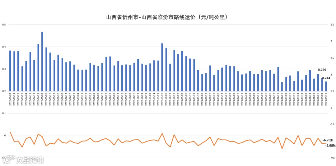 本周忻州至临汾干线周平均价为97.26元/吨,按公里数折算为0.244元/吨公里,下跌5.98%。