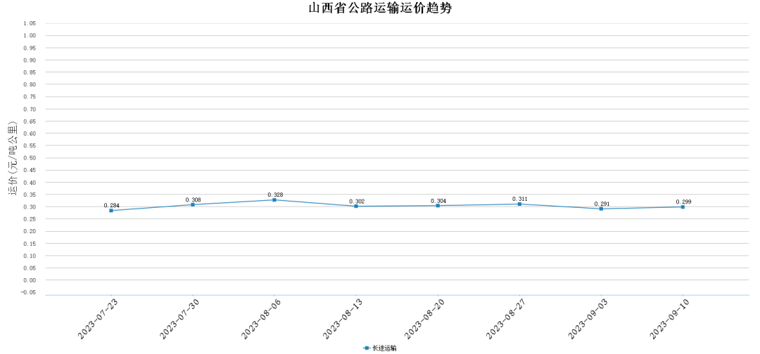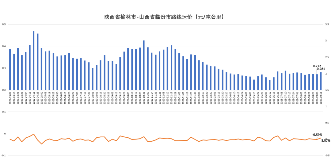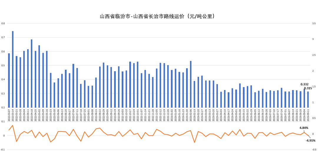 本周临汾至长治干线周平均价为69.31元/吨,按公里数折算为0.315元/吨公里,下跌4.91%。