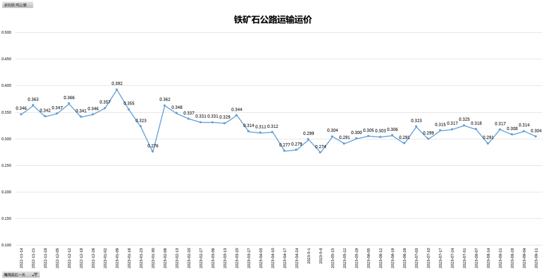 本周铁矿石运输运价为0.304元/吨公里,较上周下跌了0.01元/吨公里,跌幅为3.18%。