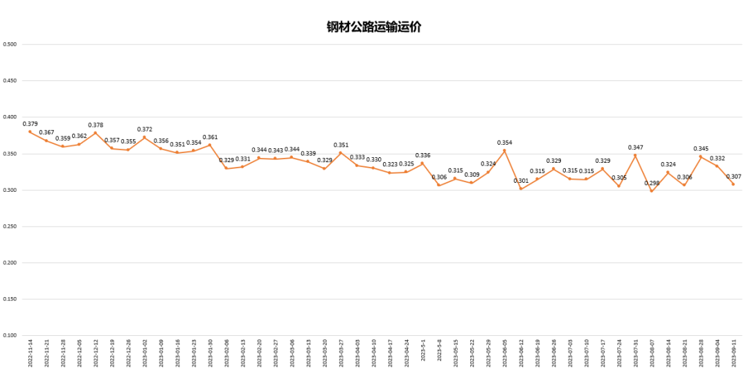 本周钢材运输运价为0.307元/吨公里,较上周下跌了0.025元/吨公里,跌幅为7.53%。