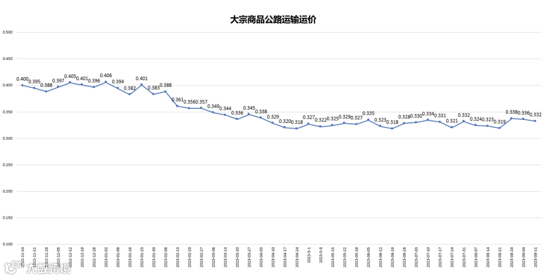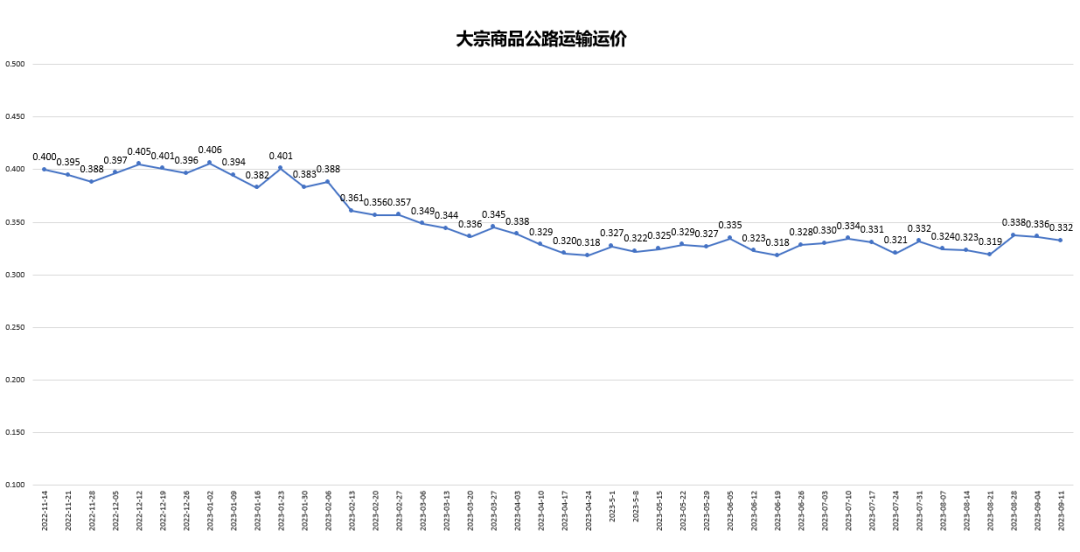 本周大宗商品公路运输运价为0.332元/吨公里,下跌1.19%。