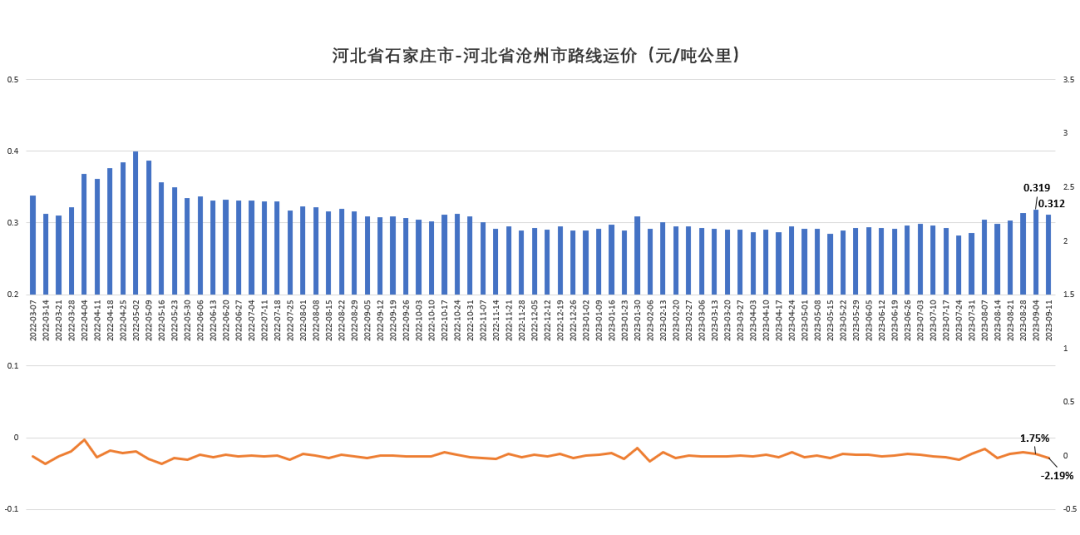本周石家庄至沧州干线周平均价为41.49元/吨,按公里数折算为0.312元/吨公里,下跌2.19%。