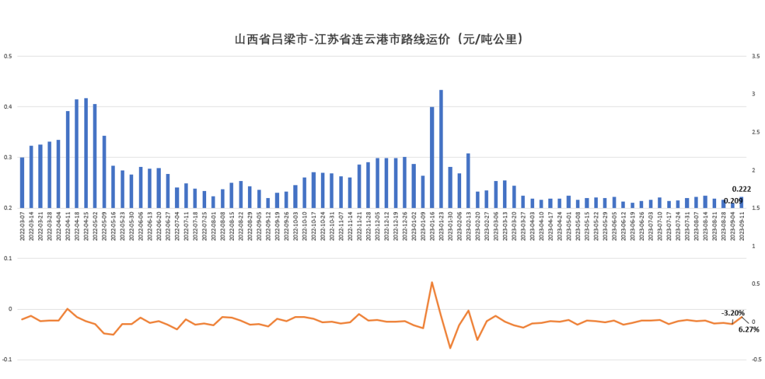 本周吕梁至连云港干线周平均价为200.54元/吨,按公里数折算为0.222元/吨公里,上涨6.27%。