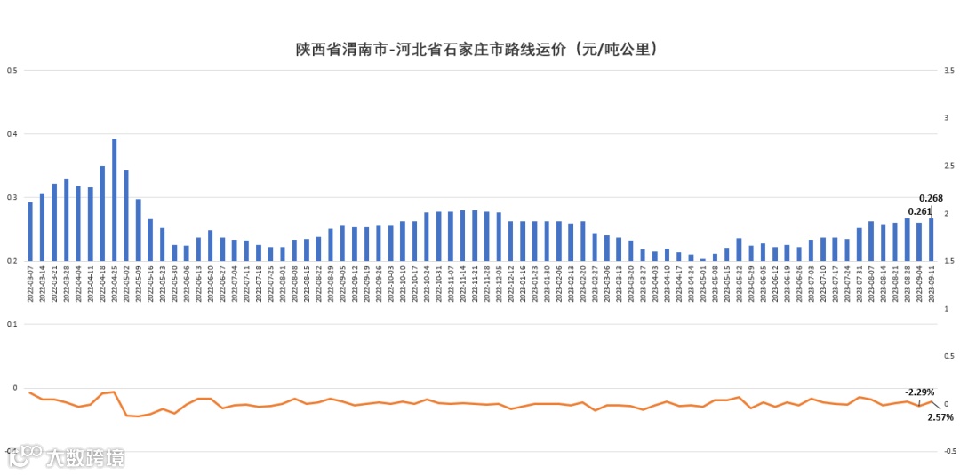 本周渭南至石家庄干线周平均价为165.87元/吨,按公里数折算为0.268元/吨公里,上涨2.57%。
