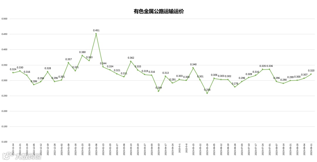 本周有色金属运输运价为0.320元/吨公里,较上周上涨了0.013元/吨公里,涨幅为4.23% 。