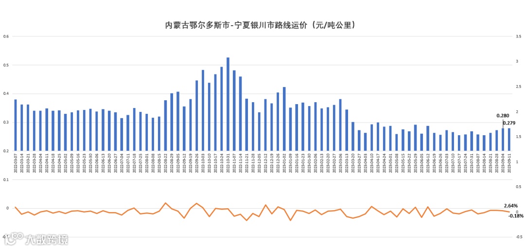 本周鄂尔多斯至银川干线周平均价为88.59元/吨,按公里数折算为0.279元/吨公里,上涨0.18%。