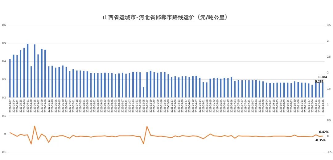 本周运城至邯郸干线周平均价为113.02元/吨,按公里数折算为0.284元/吨公里,上涨0.42%。