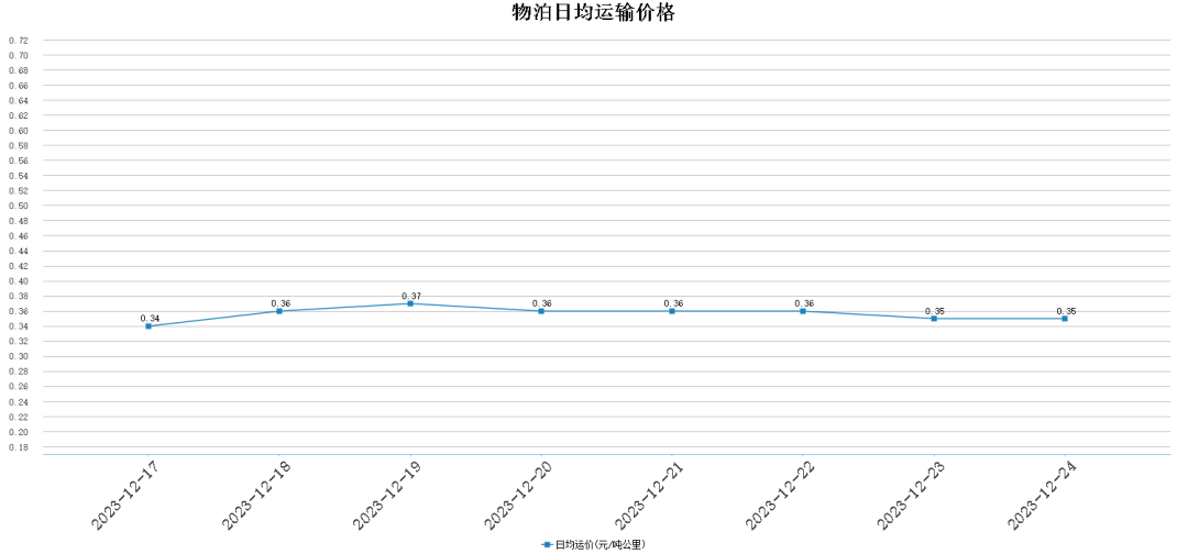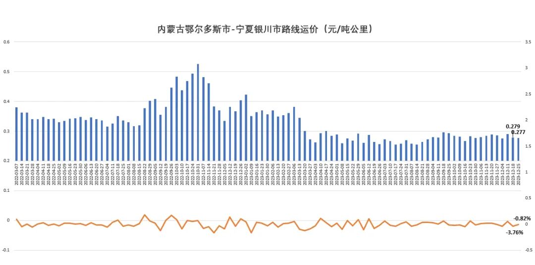 本周鄂尔多斯至银川干线周平均价为70.96元/吨,按公里数折算为0.277元/吨公里,下跌0.82%。