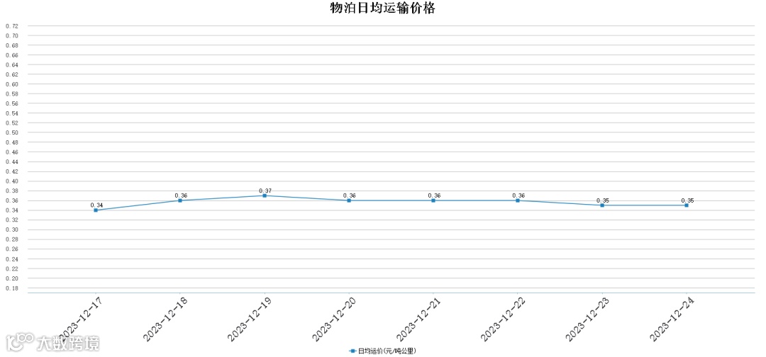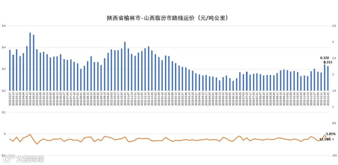 本周榆林至临汾干线周平均价为139.02元/吨,按公里数折算为0.315元/吨公里,下跌1.81%。