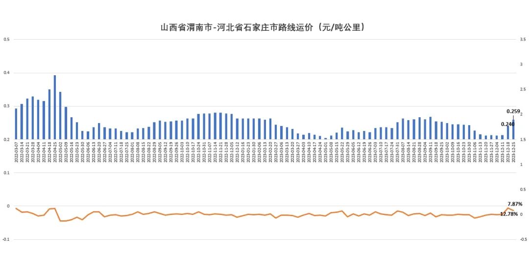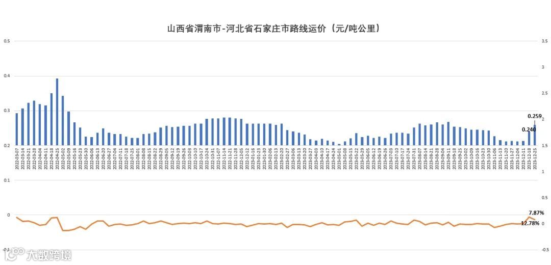本周渭南至石家庄干线周平均价为160.32元/吨,按公里数折算为0.259元/吨公里,上涨7.87%。