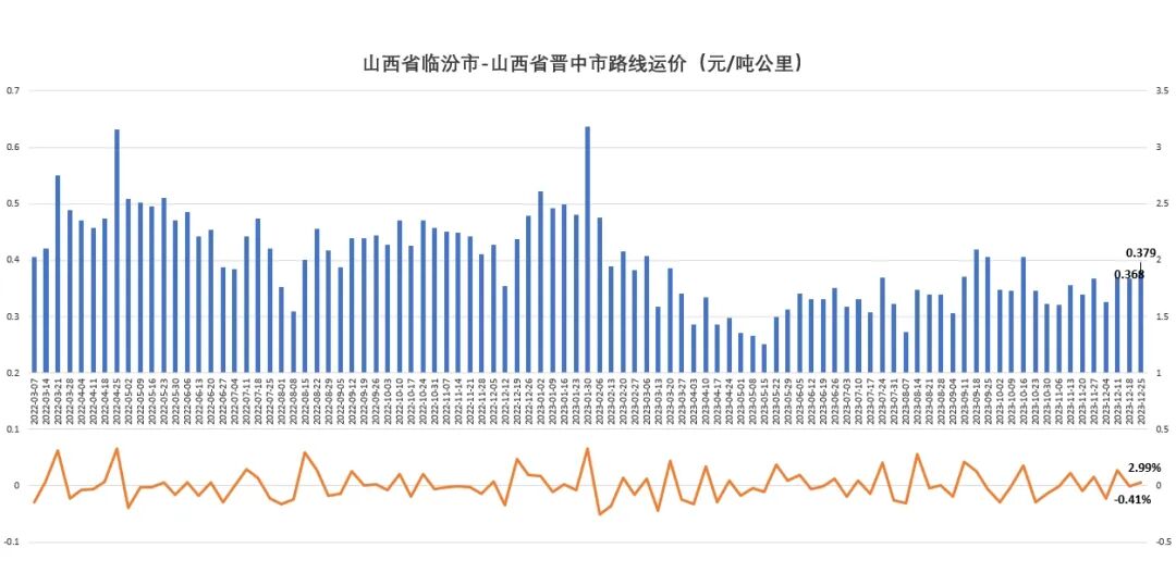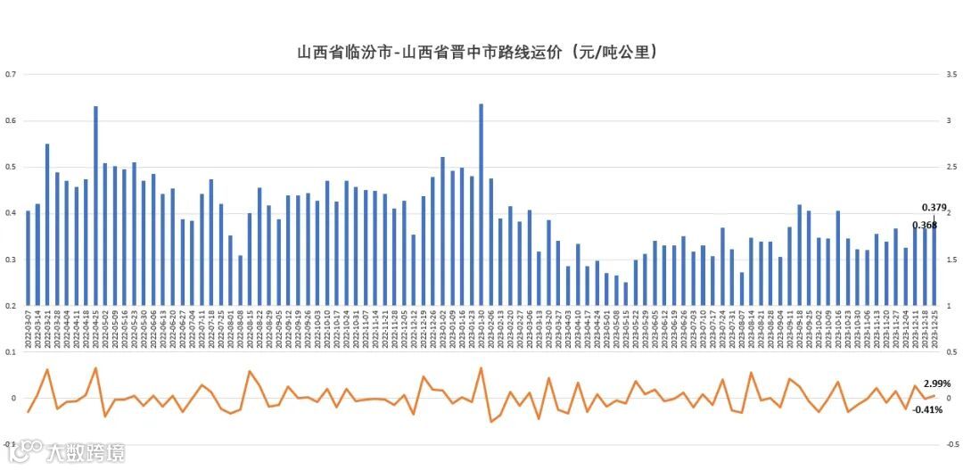 本周临汾至晋中干线周平均价为57.02元/吨,按公里数折算为0.379元/吨公里,上涨2.99%。