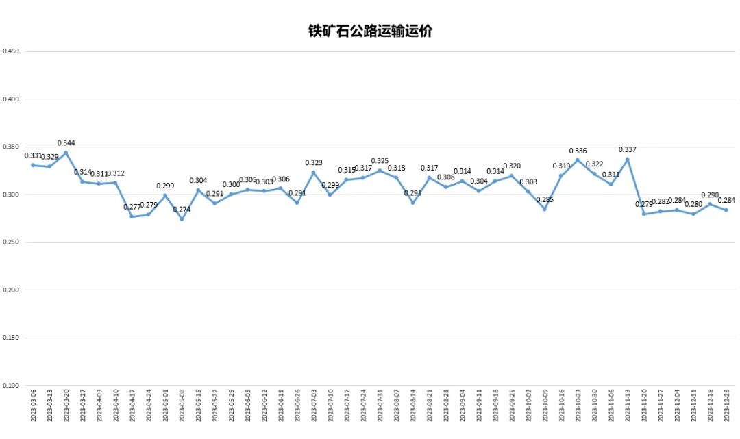 本周铁矿石运输运价为0.284元/吨公里,较上周下跌了0.006元/吨公里,跌幅为2.07%。