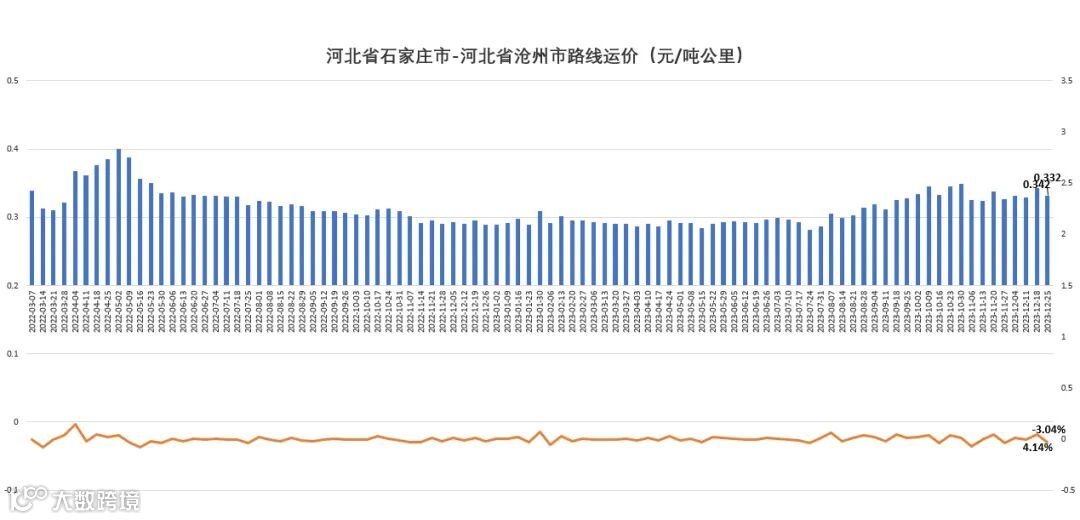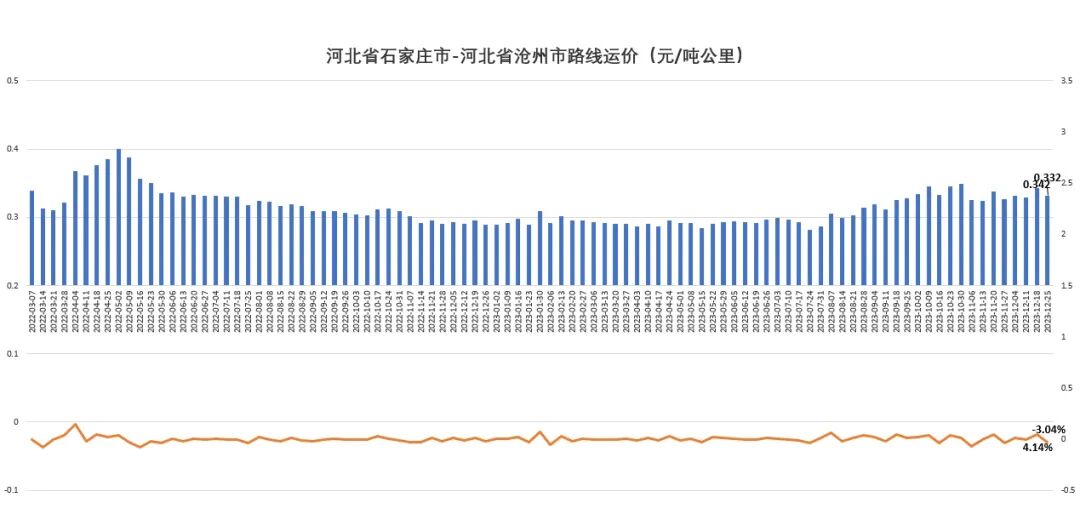 本周石家庄至沧州干线周平均价为41.02元/吨,按公里数折算为0.332元/吨公里,下跌3.04%。