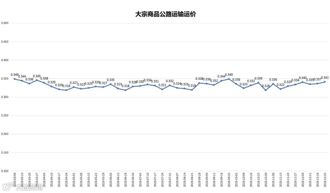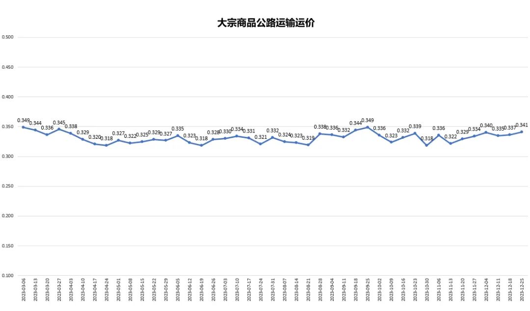 本周大宗商品公路运输运价为0.341元/吨公里,上涨1.87%。