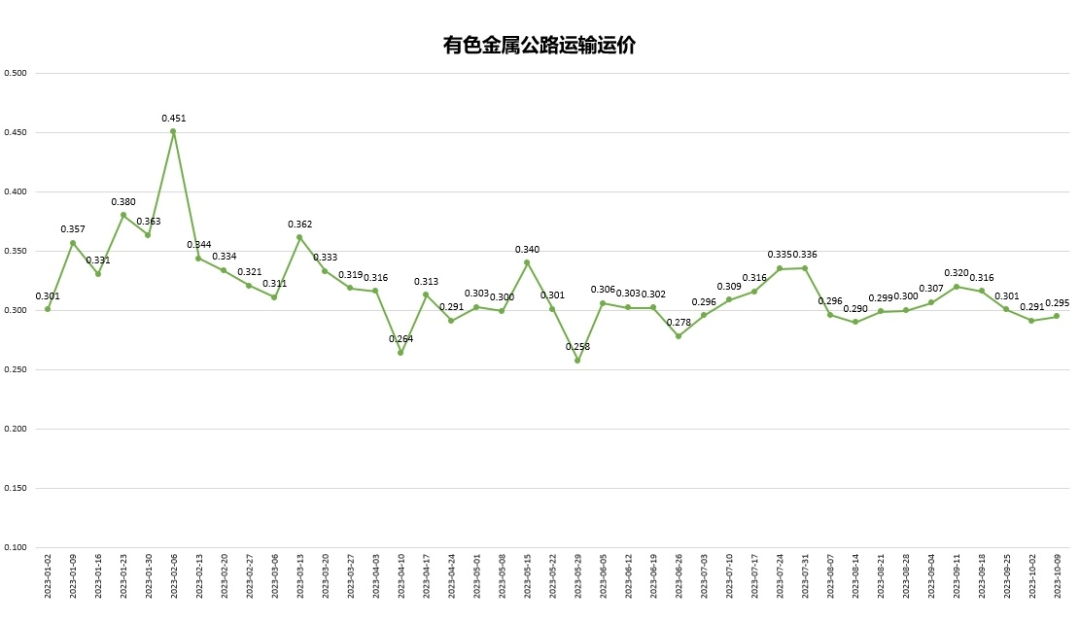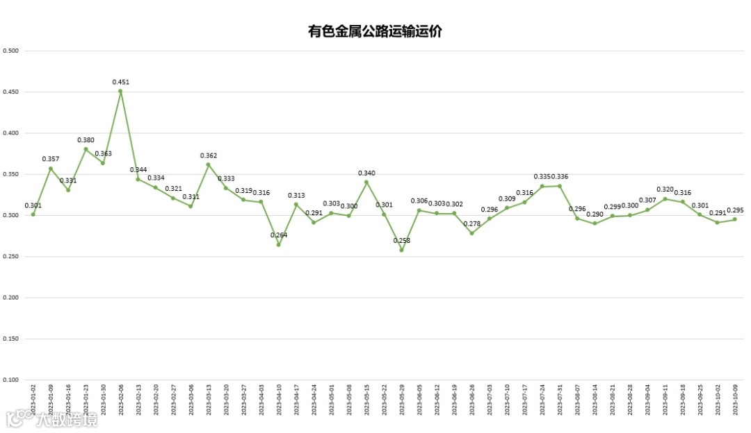 本周有色金属运输运价为0.295元/吨公里,较上周上涨了0.004元/吨公里,涨幅为1.37% 。