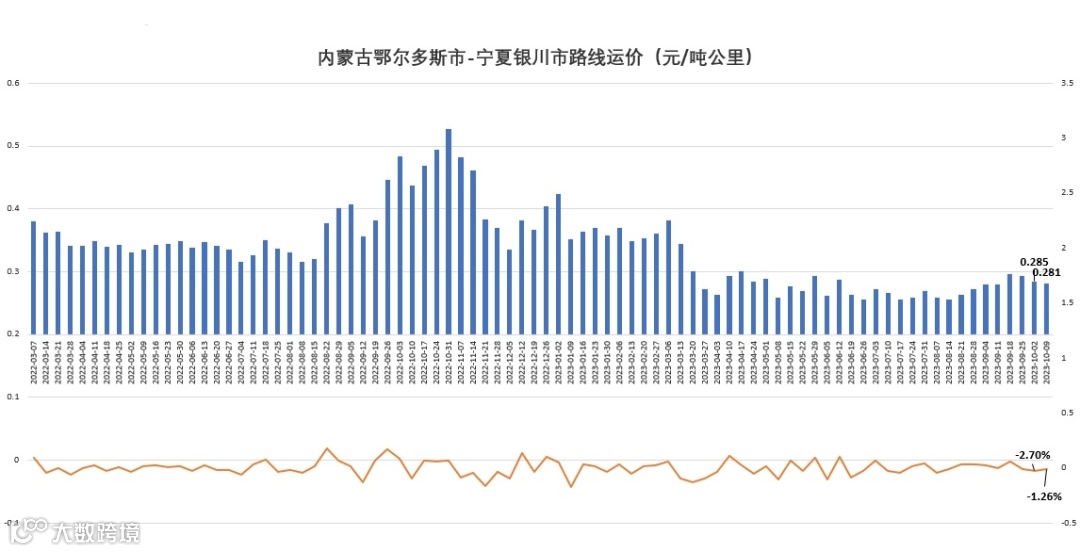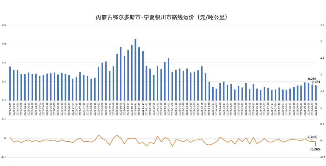 本周鄂尔多斯至银川干线周平均价为94.02元/吨,按公里数折算为0.281元/吨公里,下跌1.26%。