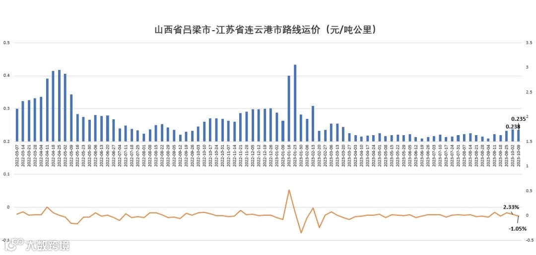 本周吕梁至连云港干线周平均价为212.17元/吨,按公里数折算为0.235元/吨公里,下跌1.05%。