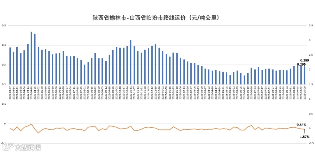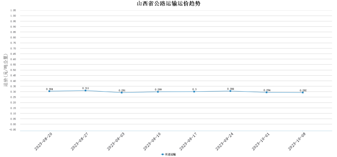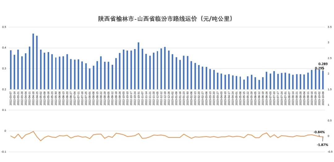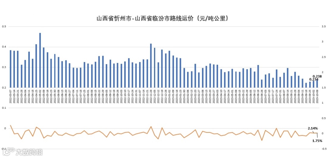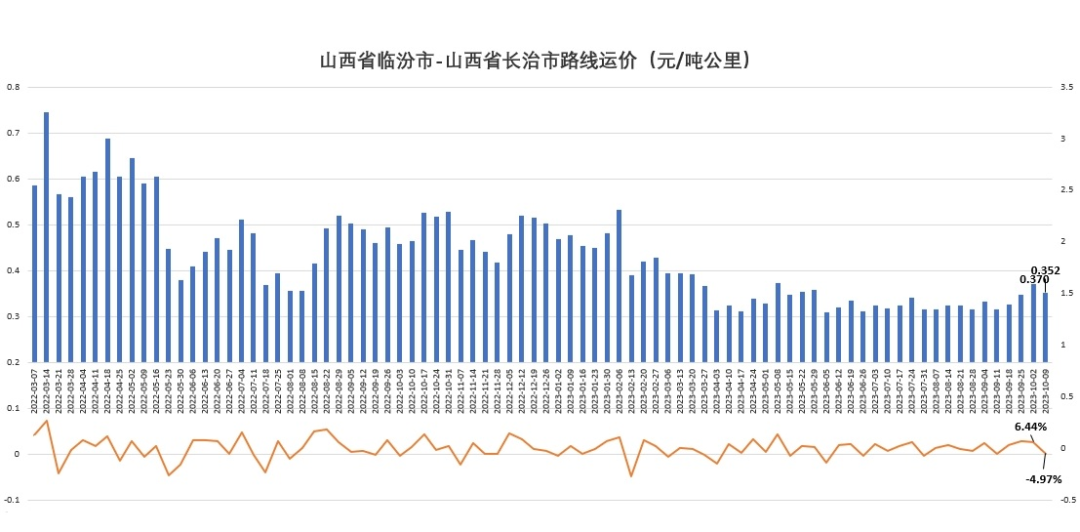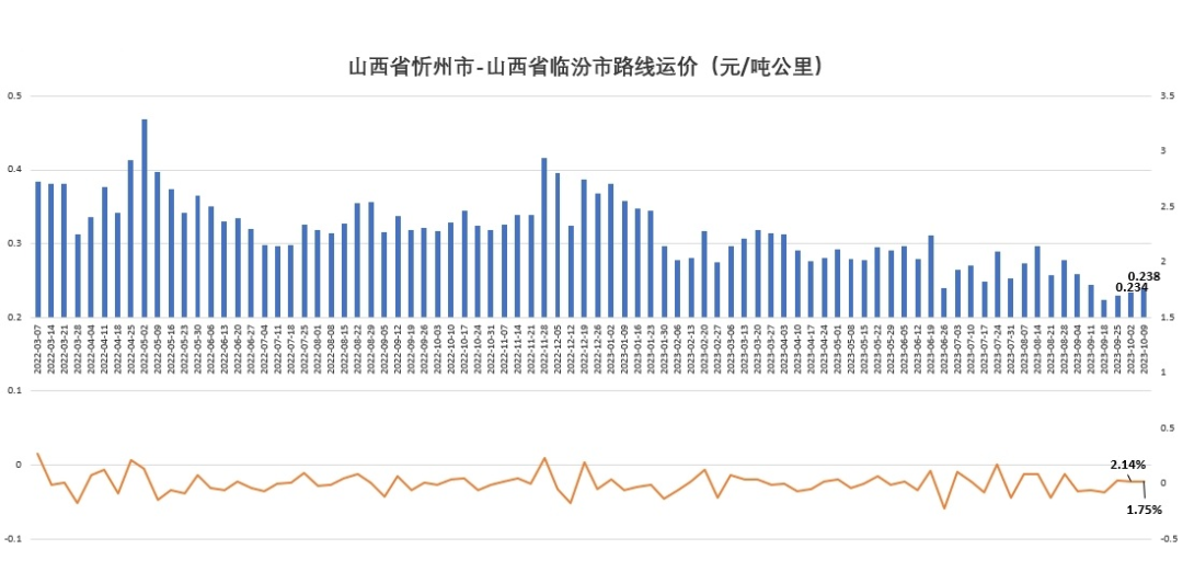 本周忻州至临汾干线周平均价为105.57元/吨,按公里数折算为0.238元/吨公里,上涨1.75%。