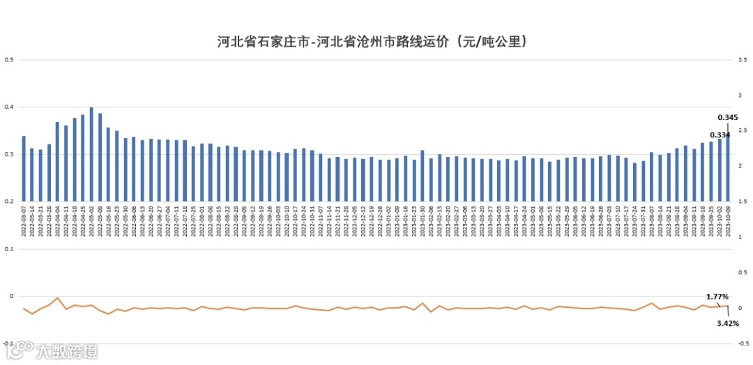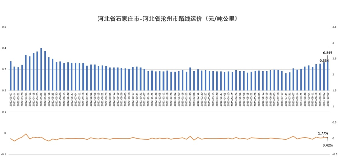 本周石家庄至沧州干线周平均价为42.55元/吨,按公里数折算为0.345元/吨公里,上涨3.42%。