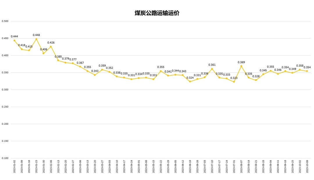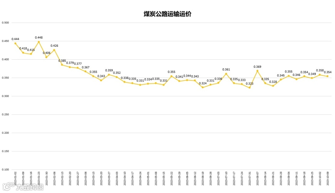 本周煤炭运输运价为0.354元/吨公里,较上周下跌了0.004元/吨公里,跌幅为1.12%。
