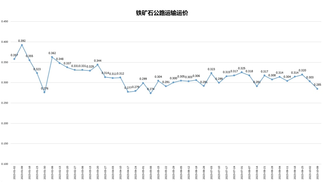 本周铁矿石价格下跌。长假期间铁矿石期货表现震荡下跌,远期现货市场整体表现相对冷清。矿山按订单正常走货。疏港方面,因假期原因疏港量季节性回落。钢厂检修高炉数量增加带动铁水产量下滑。铁矿拉运整体较为冷清。故本周铁矿石运输运价下跌。