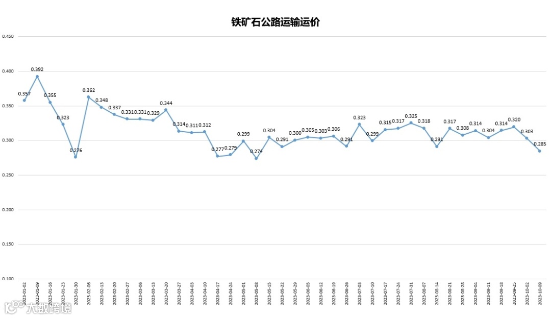 本周铁矿石运输运价为0.285元/吨公里,较上周下跌了0.018元/吨公里,跌幅为5.94%。