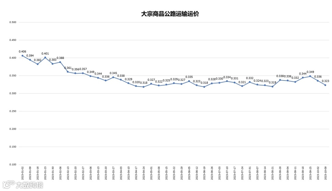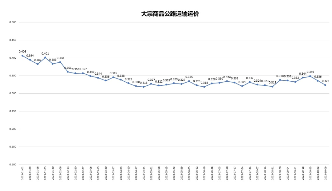 本周大宗商品公路运输运价为0.323元/吨公里,下跌3.87%。