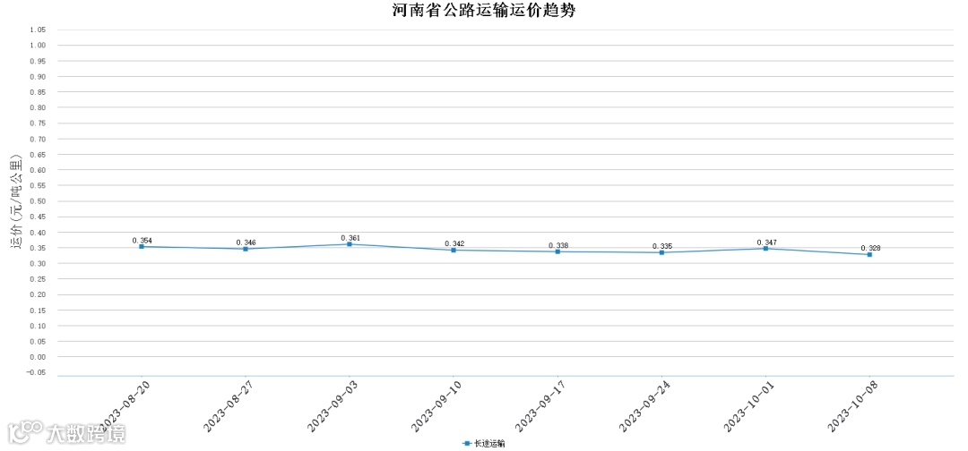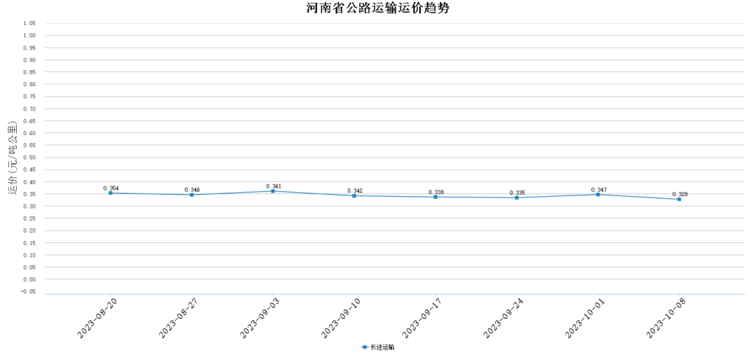 本周河南公路运输运价为0.328元/吨公里,较上周下跌了0.019元/吨公里,跌幅为5.48%。