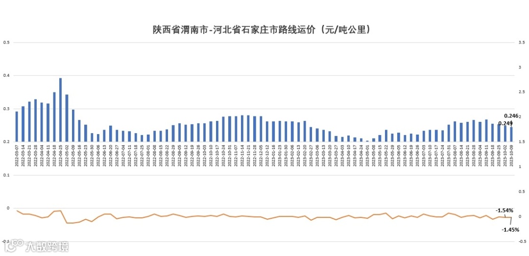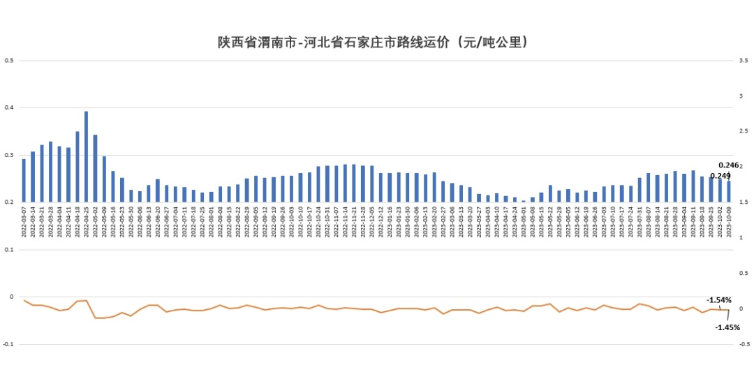 本周渭南至石家庄干线周平均价为152.16元/吨,按公里数折算为0.246元/吨公里,下跌1.45%。