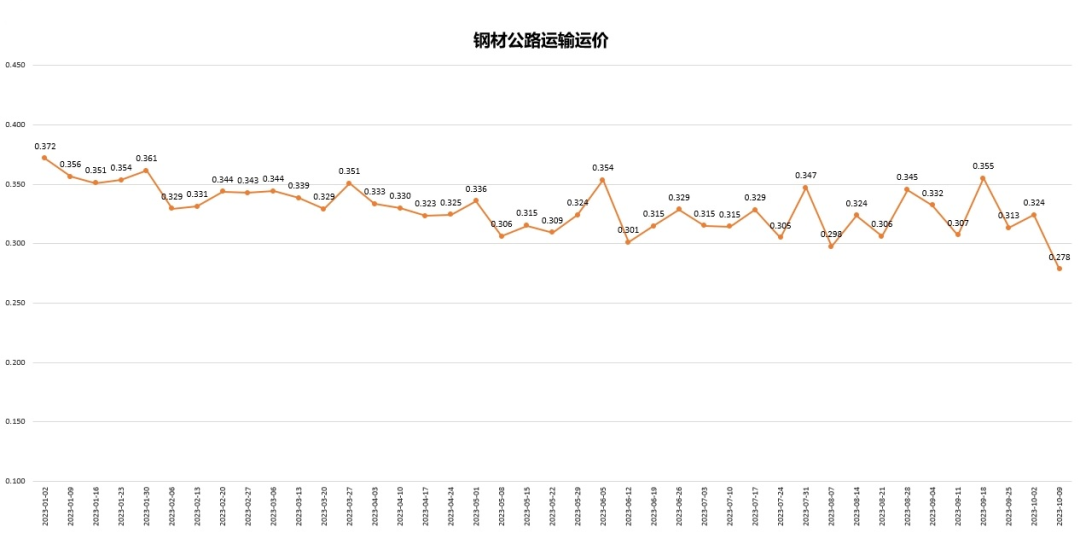 本周钢材价格下跌。双节假期,下游采购需求较弱,出货节奏受限,叠加国内多地延续阴雨天气,施工进度整体放缓,部分企业轮休,钢材市场呈现出供需双弱格局,交易氛围寡淡,成交水平一般,市场心态持续萎靡,导致公路运输整体需求放缓。故本周钢材运输运价下跌。