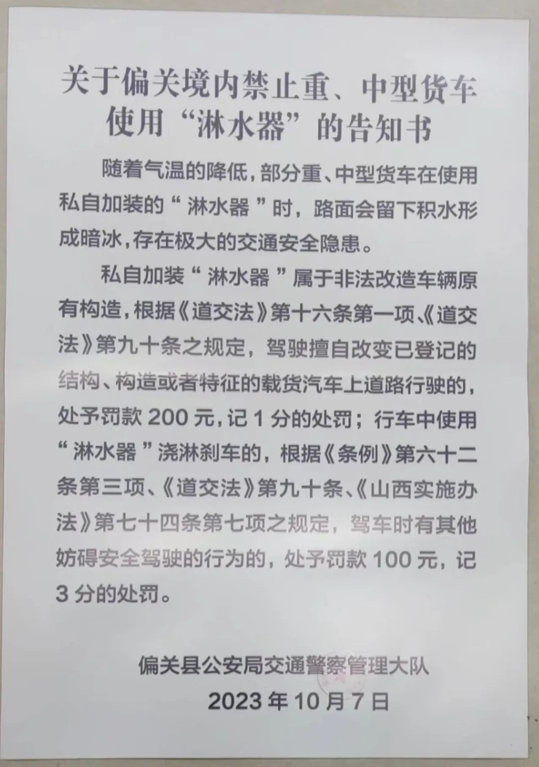 山西偏关发布《关于偏关境内禁止重、中型货车使用“淋水器”的告知书》