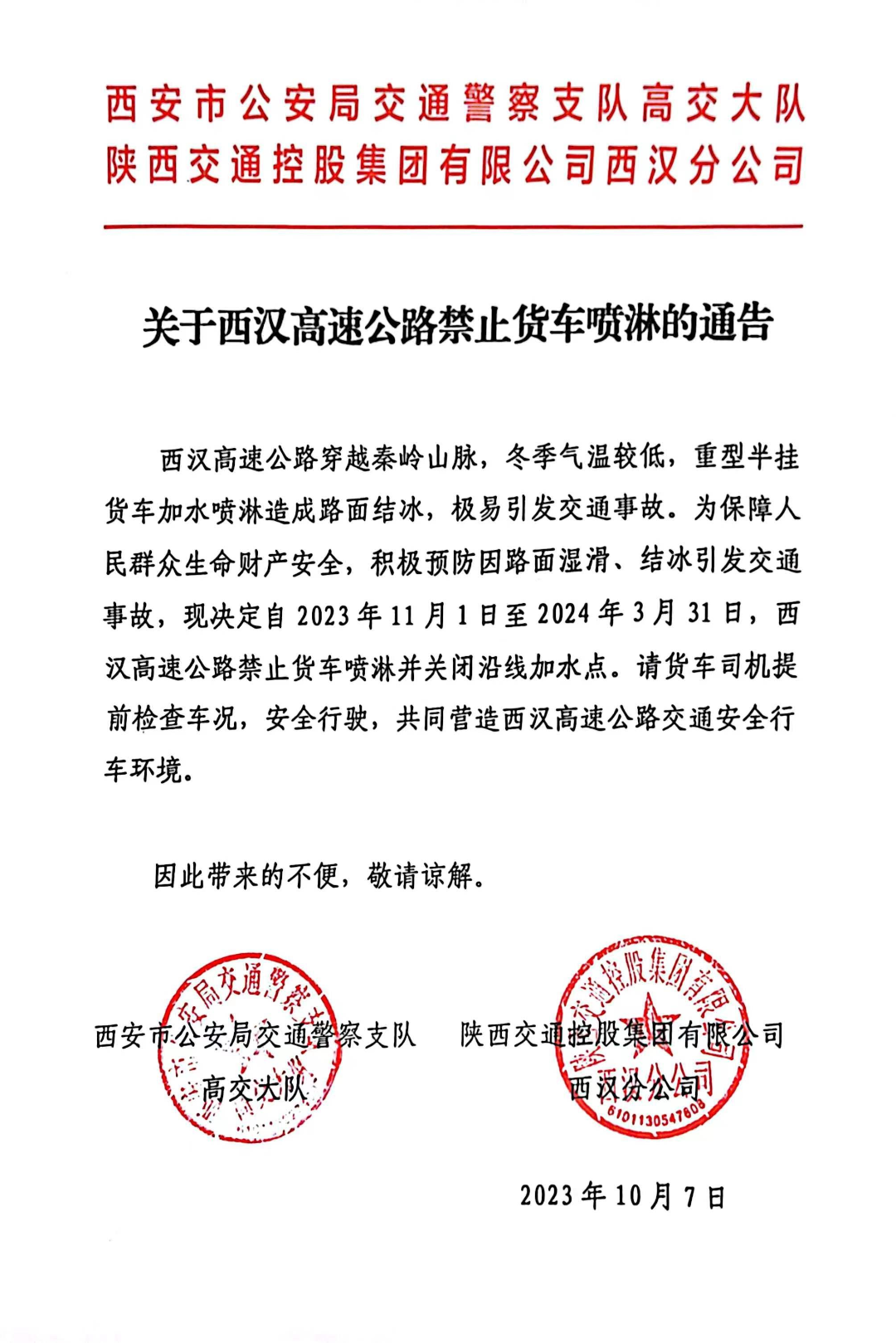 10月25日,西安发出通告,提醒西汉高速公路禁止货车喷淋:为保障人民群众生命财产安全,积极预防因路面湿滑、结冰引发交通事故,自2023年11月1日至2024年3月31日,西汉高速公路禁止货车喷淋并关闭沿线加水点。