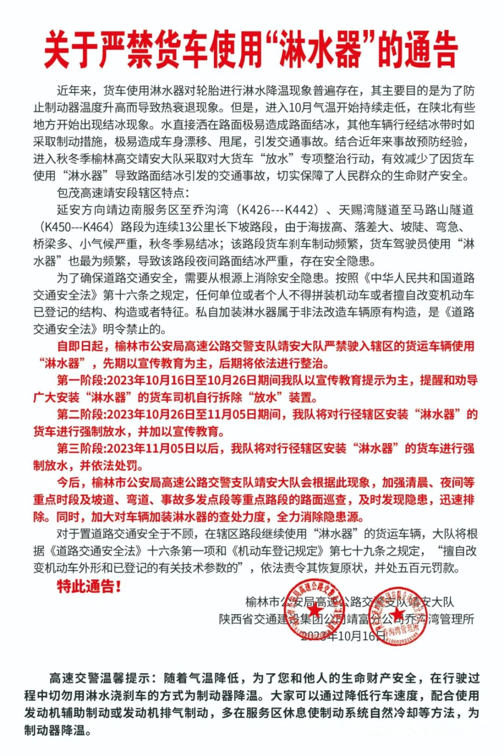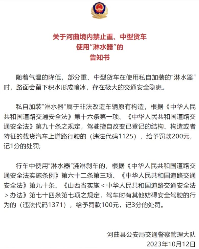 山西河曲发布《关于河曲境内禁止重、中型货车使用“淋水器”的告知书》