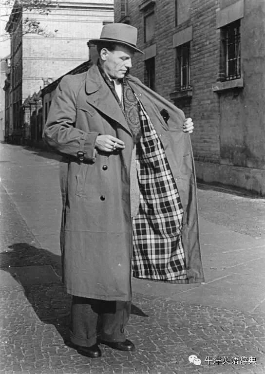 trench coat(军用防水短上衣)——看起来经典实用,似乎永远不会过时——它在20世纪早期首先流行开来。20世纪20年代出现了松松垮垮式带腰带的双排扣雨衣,不禁让人联想起早期的“trench coat”, “trench coat”是二战时期士兵们在战场壕沟中所穿的一种带有里衬的防水雨衣。正如亨弗莱·鲍嘉(Humphrey Bogart)所证实的那样,trench coat通常还带有一个fedora(软呢帽)或是一个homburg hat(汉堡帽);fedora因维克托里安·萨尔杜(Victorien Sardou)1882年的法国话剧Fédora而得名,在这部话剧里,女主角戴了一顶手感非常柔软的帽子,这种帽子在20世纪早期以后便风靡起来。 homburg hat因德国Bad Homburg(巴特洪堡)而得名,Bad Homburg是homburg hat首次被穿戴之地。