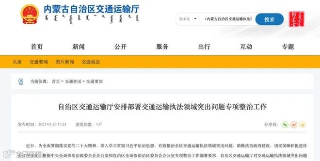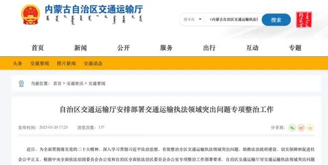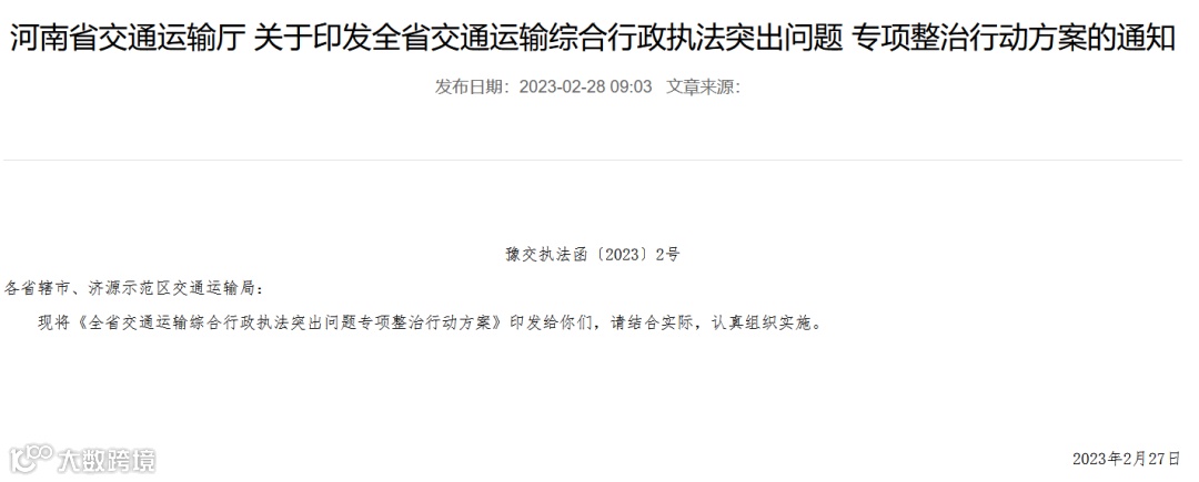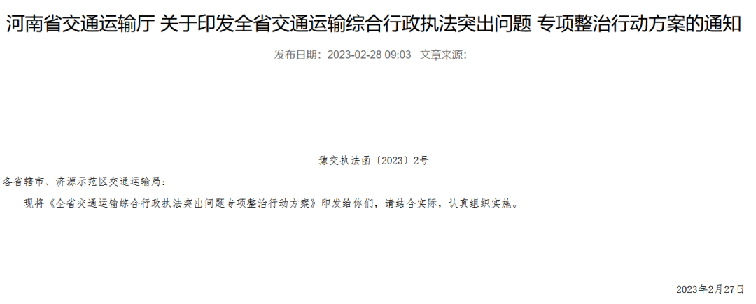 近日,河南省交通运输厅发布《全省交通运输综合行政执法突出问题专项整治行动方案》,决定自2023年2月至4月在全省范围内集中开展交通运输综合行政执法突出问题专项整治行动。