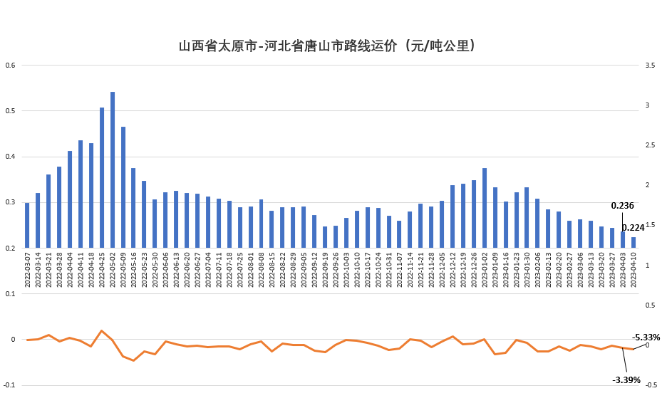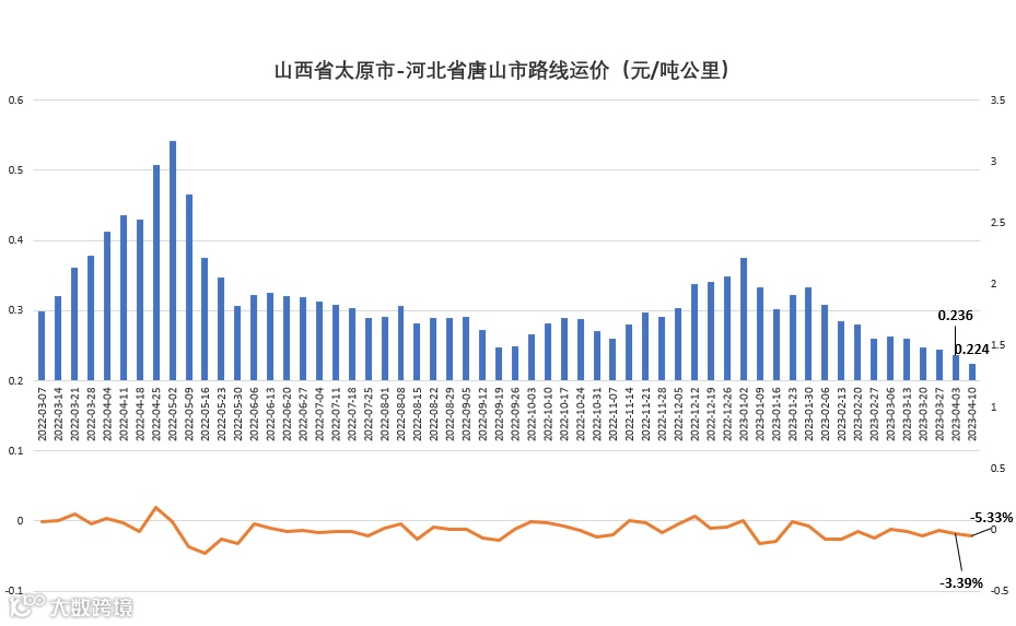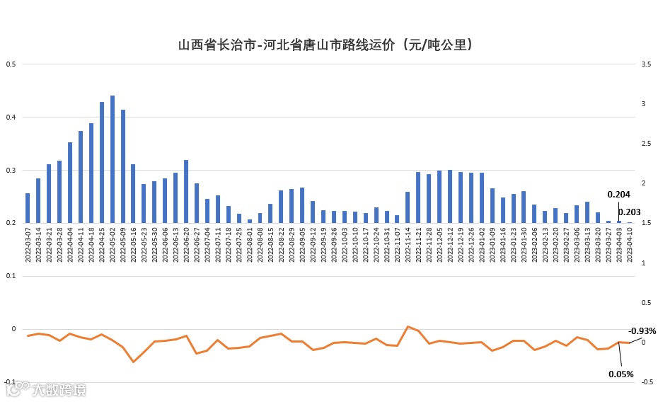 本周长治至唐山干线周平均价为127.93元/吨,按公里数折算为0.203元/吨公里,下跌0.93%。