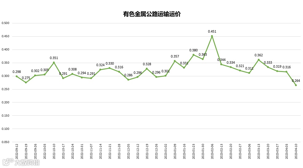 本周有色金属运输运价为0.264元/吨公里,较上周下跌了0.052元/吨公里,跌幅为16.45% 。