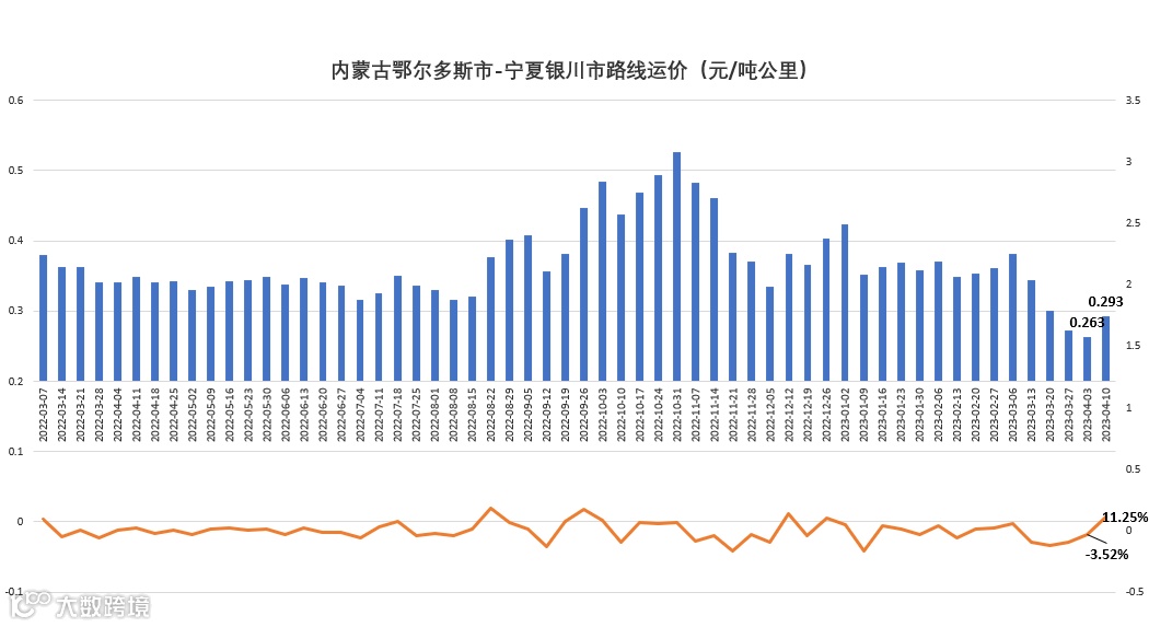 本周鄂尔多斯至银川干线周平均价为93.84元/吨公里,按公里数折算为0.293元/吨公里,上涨11.25%。