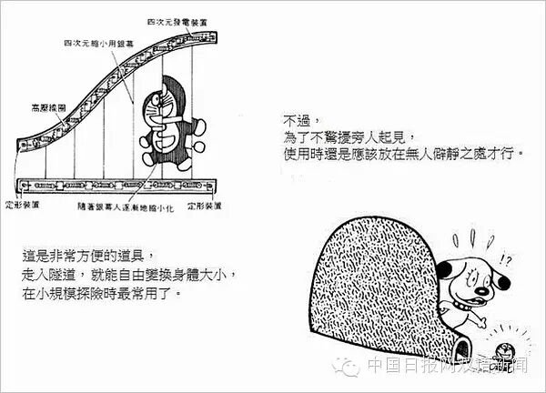 变小手电筒,把人和物体缩小。相反的是变大手电筒,放大人和物。类似的工具是变大变小隧道,人的身形根据进入的方向变大或变小。